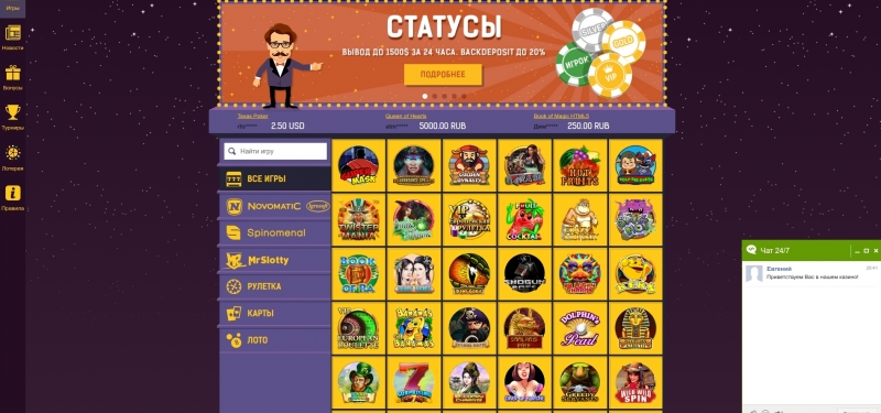 🍀 Плюсы интернет клуба: множество бонусов, постоянные турниры и акции, мобильная версия казино, несколько валют для расчета, качественные игровые автоматы, бесплатные игры, работающее зеркало на каждый день. Сотрудники круглосуточной техподдержки всегда на связи и помогут каждому посетителю сайта в любое время суток. Минусы: нет джекпота, вывод только в рабочие дни.