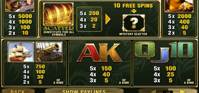 Кроме специальных символов, на вращающихся пяти барабанах появляются картинки с изображением пиратского судна, легендарного попугая, главного орудия корабля пушечного типа и многое другое.